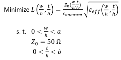 解決此類問題的最佳選擇是使用迭代優(yōu)化算法來確定(w / h)和(t / h)的值,以最小化每單位長度的PCB走線電感??梢允褂锰荻认陆邓惴?,進化算法,Kuhn-Tucker方法或其他非線性優(yōu)化算法輕松解決此類問題。這使您可以定義(w / h)值的實際上限和下限。您還可以設置(t / h)值的限制,并根據(jù)需要將此比率用作優(yōu)化變量。