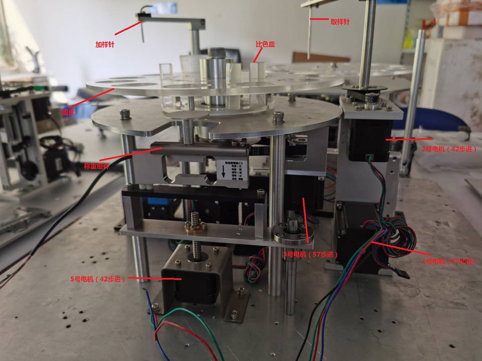 三、樣本杯中放入2g左右的樣本(我們儀器現在設置的樣本秤取范圍為1.8-3.0g之間),放入秤上,秤感應樣本重量在正常范圍之內后,圓盤轉動一個杯位(3號電機動作),再放入下一個樣本,再轉動一個杯位,以此類推,直至放入最后一個樣本,秤自動下降至原位(5號電機動作)。